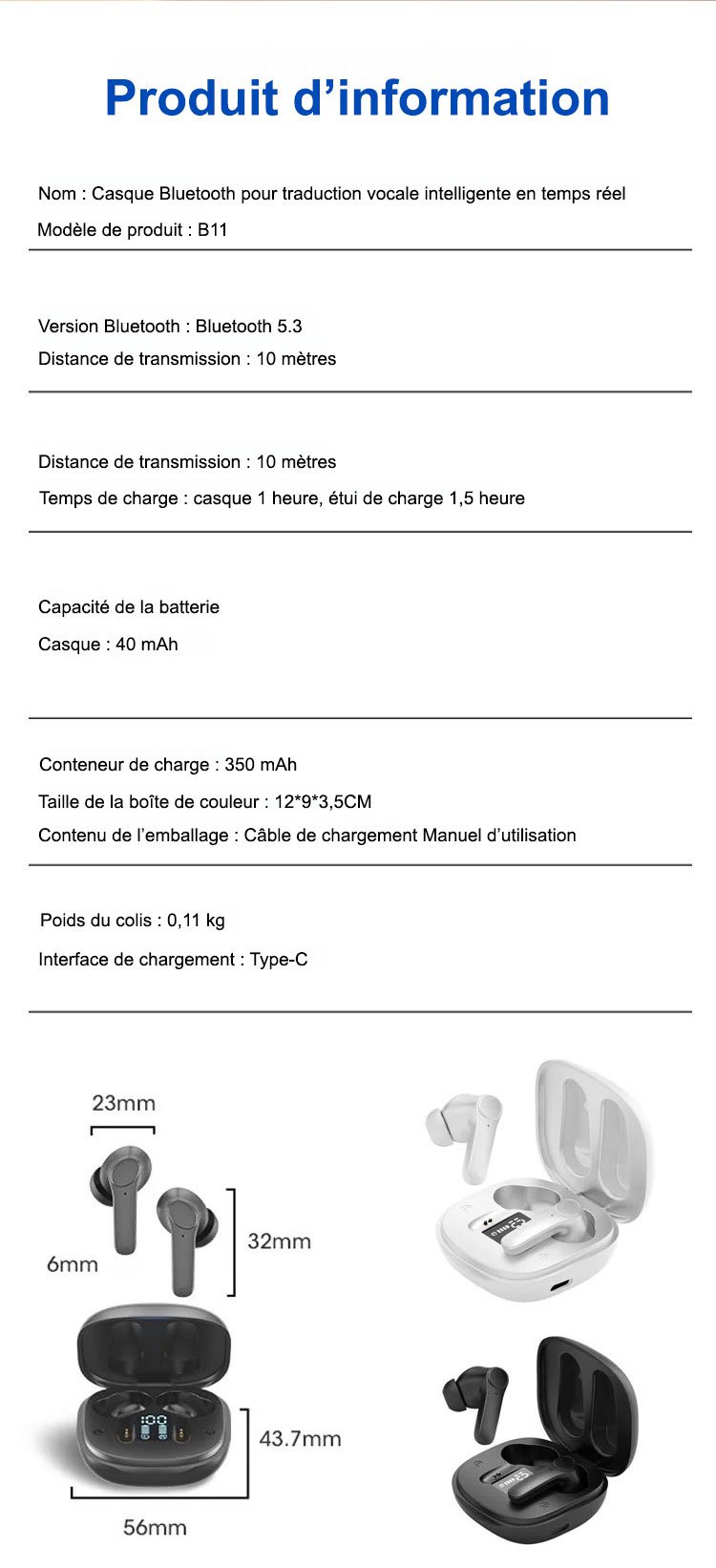Casque de traduction en temps réel Bluetooth Smart Voice